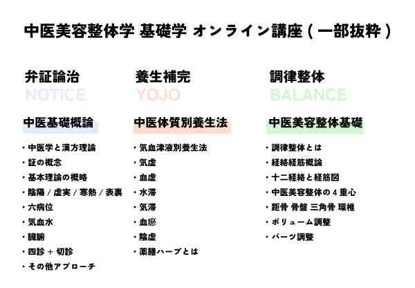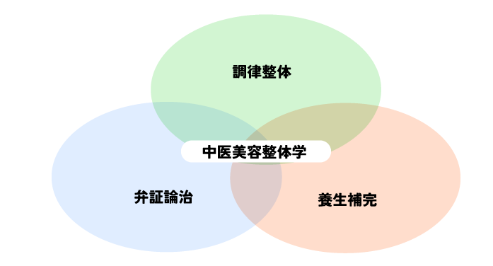 中医美容整体学の軸は「調律整体」「弁証論治」「養生補完」の3つ。