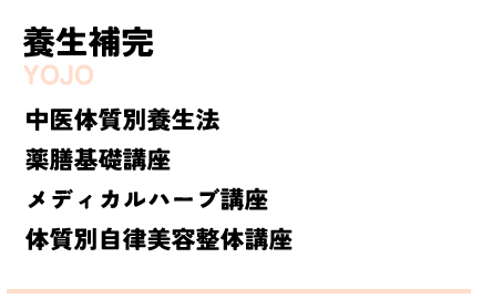 心身のゆらぎをおだやかに整え、眠りに導くほどにリラッ クスして緩めるテクニック、 またバランスを見て自分らしい自然なラインへと美しく締めるなど、実践的な調律整体のテクニックをお伝えします。「養生補完」とは、食や生活リズムを整え、体の内側から体質バランスを整える「薬膳」と言われる日々の生活の知恵のこと。中医美容整体学では、実際の生活に取り入れやすい薬膳学、メディカルハーブ学、自律整体学など、未病予防につながる養生法を学びます。